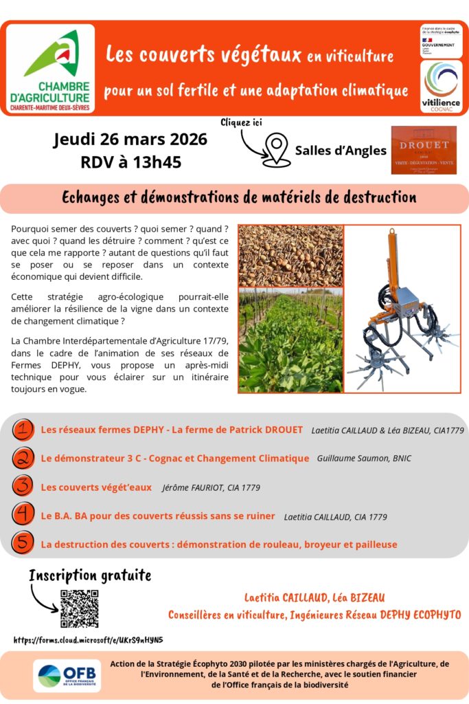 La Chambre Interdépartementale d’Agriculture de Charente-Maritime Deux-Sèvres organise une après-midi technique « Les couverts végétaux en viticulture », dans le cadre de l’animation de ses réseaux de Fermes DEPHY. Rendez-vous donné jeudi 26 mars à Salle-d’angles à 13h45.