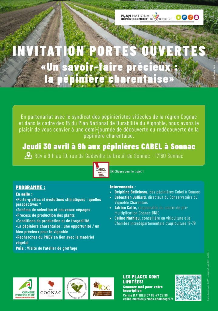 En partenariat avec le syndicat des pépiniéristes viticoles de la région Cognac et dans le cadre des 15 du Plan National de Durabilité du Vignoble, l’UGVC relaie l’invitation à une demi-journée de découverte ou redécouverte de la pépinière charentaise.
